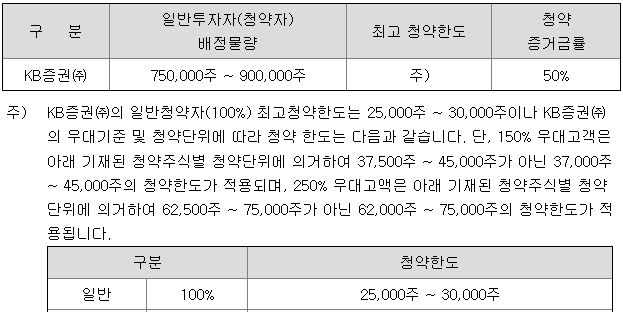 KB증권의 일반 청약자 배정 물량은 750,000주 ~ 900,000주이고, 일반 청약자의 최고 청약 한도는 25,000주 ~ 30,000주입니다.