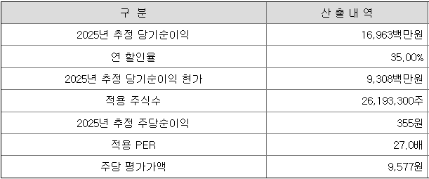 회사의 주당 평가가액은 2025년 추정 당기순이익을 할인하여 현재가치로 환산한 후, 주식 수로 나누어 주당 순이익을 구하고, 여기에 유사회사의 평균 PER배수를 곱하여 산출한 것입니다.