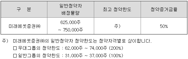 미래에셋증권의 일반 청약자 배정 물량은 625,000주 ~ 750,000주이고, 일반 청약자의 최고 청약 한도는 일반그룹 기준 31,000주 ~ 37,000주입니다.