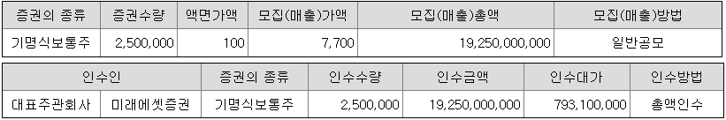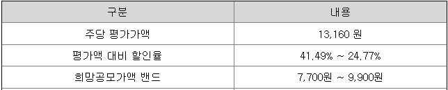 총 모집 금액은 희망 공모가 하단 7,700원 적용 시 약193억원이고, 희망가 상단 9,900원 적용 시 약 250억원입니다.