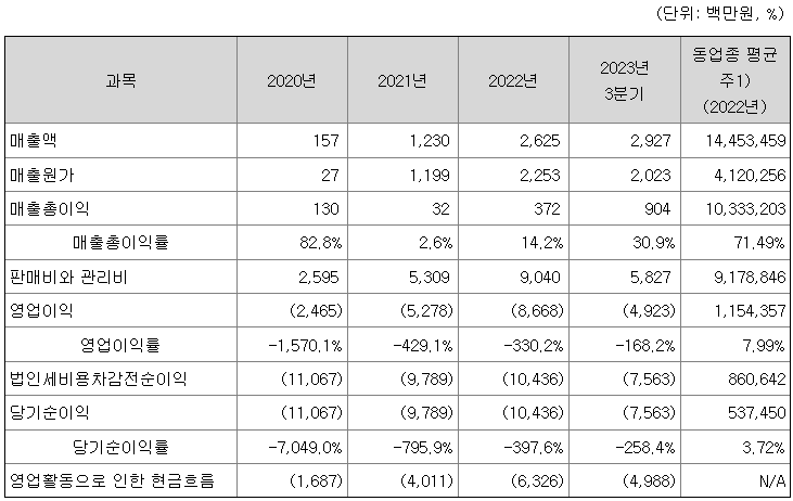 아이엠비디엑스의 매출액은 2020년 157백만원에서 2021년 12억, 2022년 26억으로 증가하였으며, 2023년 3분기말까지 29억의 실적을 기록하고 있습니다.