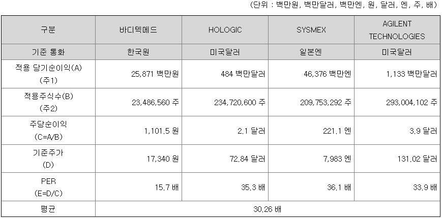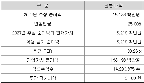 회사의 주당 평가가액은 2027년 추정 순이익을 할인하여 현재가치로 환산한 후, 유사회사의 평균PER배수를 곱하여 회사가치를 정하고, 이를 주식수로 나누어 산출한 것입니다.