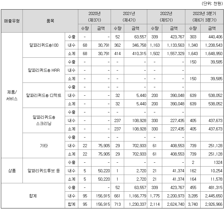 프로파일링 기술인 알파리퀴드®100은 NGS 유전자 패널 실시 승인기관 총 69개 중 33개 기관의 병원 내 처방코드로 결정되어 50% 선별급여 서비스로 제공되고 있고, K-Master 사업에서 종양진단 액체생검 검사방법으로 채택되어 사용되었습니다. 대만 등 해외 17개국 시장에 진입한 상태이며, 중국 진출을 위하여 루캉사와의 액체생검기술 라이선스아웃 등 전략적 파트너십 구축을 논의하고 있습니다. 알파리퀴드®HRR은 아스트라제네카의 센트럴랩으로써 란파자의 거세저항성 전이성 전립선암 환자 대상 동반진단에 활용 중입니다.