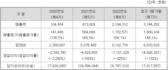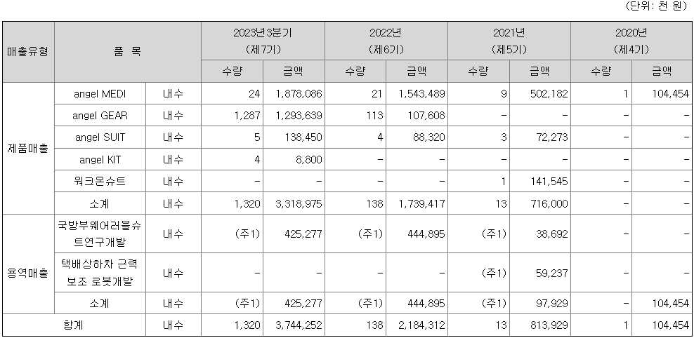 엔젤로보틱스의 매출은 2020년 1억에서 2021년 8억, 2022년 22억으로 증가하였으며, 2023년 3분기말 현재 37억의 실적을 기록하고 있습니다.