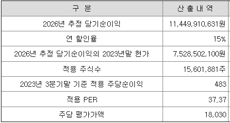 회사의 주당 평가가액은 2026년 추정 순이익을 할인하여 현재가치로 환산한 후, 주식 수로 나누어 주당 순이익을 구하고, 여기에 유사회사의 평균 PER배수를 곱하여 산출한 것입니다.