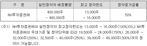 NH투자증권의 일반 청약자 배정 물량은 400,000주 ~ 480,000주이고, 일반 청약자의 최고 청약 한도는 13,000주  ~  16,000주입니다.