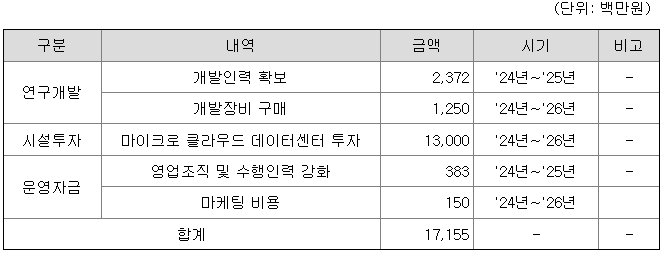 이노그리드는 금번 공모를 통해 조달된 자금으로 시설투자에 130억, 연구개발에 24억을 사용하고 , 나머지 5억을 운영자금으로 사용할 계획입니다.