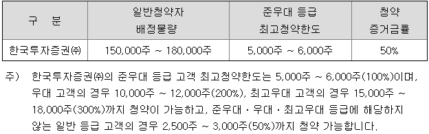 한국투자증권의 일반 청약자 배정 물량은 150,000주 ~ 180,000주이고, 일반 청약자의 최고 청약 한도는 일반 등급 기준 2,500주 ~ 3,000주입니다.