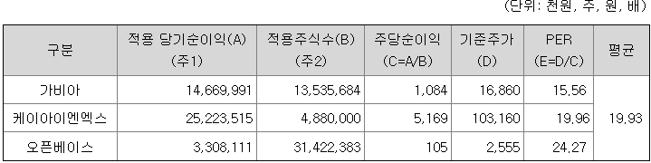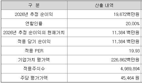 회사의 주당 평가가액은 2026년 추정 순익익을 할인하여 현재가치로 환산한 후, 유사회사의 평균 PER배수를 곱하여 회사가치를 정하고, 이를 주식수로 나누어 산출한 것입니다.