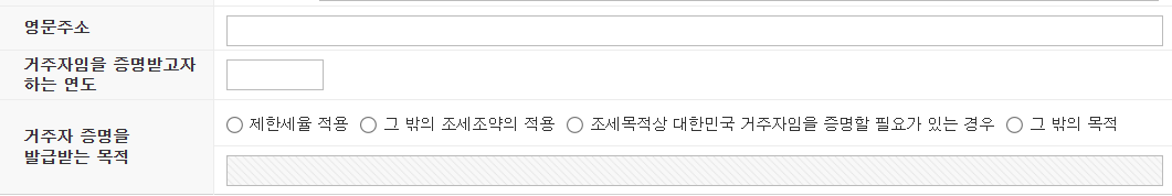 거주자증명서 발급 신청서에는 기본 인적 사항이 나오고, 그 밑으로 거주자증명을 발급받는 목적을 선택하는 항목이 있는데, 저는 조세목적상 대한민국 거주자임을 증명할 필요가 있는 경우를 클릭하였습니다.