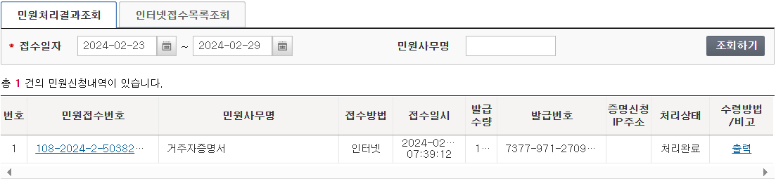 그렇게 신청을 마치고 민원 신청 내역을 조회해 봤더니 담당자가 나오고 처리 중이라는 메시지만 보이는 상태에서, 담당 공무원이 전화를 주셨고 몇 가지 질의응답을 거쳐 (이 과정에서 발급대상국가를 대한민국이 아닌 미국으로 수정하게 되었습니다.) 마침내 처리완료 메시지를 받았고, 프린터로 출력할 수 있었습니다.