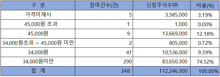 수요예측 신청 가격은 34,000미만 신청이 290건에 83.6백만주로 전체 신청의 74.52%를 차지하여 공모 희망가 하단 이하로 공모가를 끌어내린 지표가 되었던 것으로 보입니다.