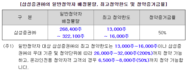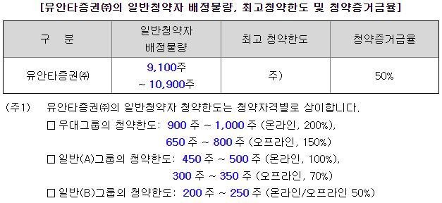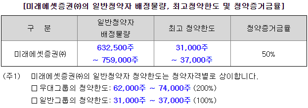 일반 청약자의 최소 청약 한도는 20주이고 , 일반 기준 최대 청약 한도는 미래에셋증권 31,000주 ~ 37,000주, 삼성증권 13,000주 ~ 16,000주, 유안타증권 450주 ~ 500주입니다.