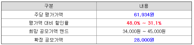 확정공모가 28,000원은 쏘카의 주당 평가가액 61,934원에서 54.79% 할인한 가격입니다.