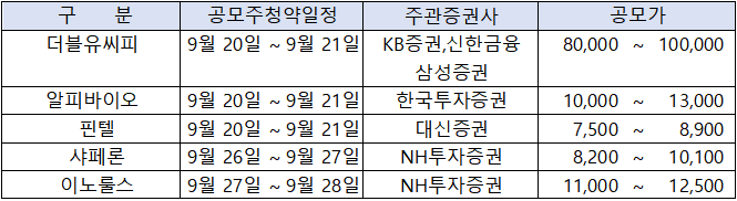 당초 7월 공모 에정이었던 더블유씨피가 9월 20일과 9월 21일에 청약 접수 예정이고, 알피바이오등 중소형 종목이 청약을 준비하고 있습니다.