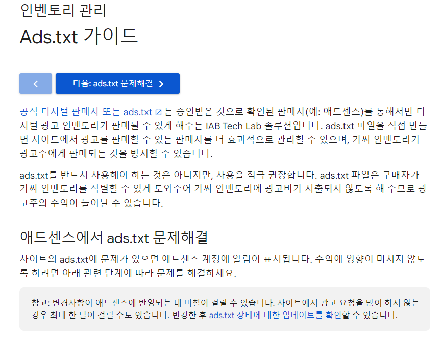 [구글 애드센스 ads.txt 문제 메시지]
