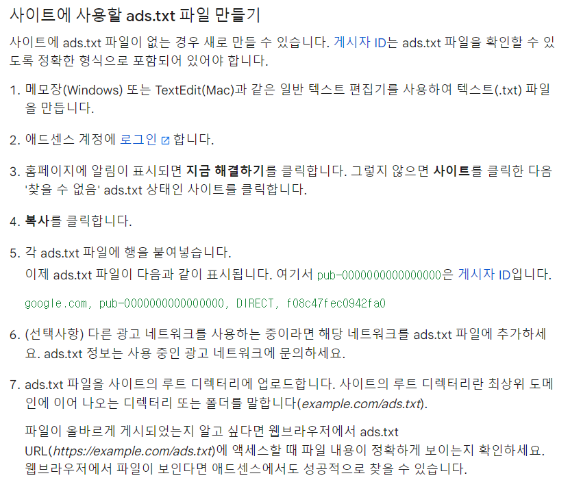 자세히 알아보기를 클릭한 결과 애드센스에서 사이트를 클릭해서 '찾을 수없음'ads.txt상태인 사이트를 다시 클릭하면 ads.txt파일을 복사할 수 있고, 이 파일을 사이트의 루트디렉토리에 업로드해야한다는 것까지 이해했습니다만, ads.txt파일을 만들고 내 사이트의 루트 디렉토리에 업로드는 어떻게 햐야하는지에서 다시 막혔습니다.