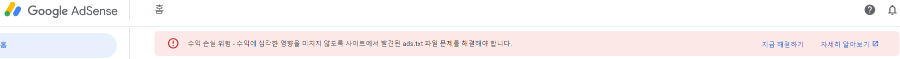 더 자세하게는 아래 그림과 같이 '수익 손실 위험 - 수익에 심각한 영향을 미치지 않도록 사이트에서 발견된 ads.txt 파일 문제를 해결해야합니다.'라는 메시지가 뜬 것입니다.