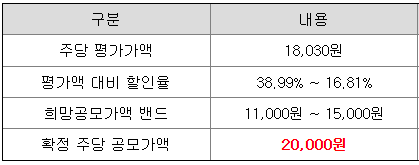 다만, 확정 공모가를 주당 평가가액 18,030원보다도 높은 20,000원으로 결정한 것은 다소 아쉬운 대목입니다.