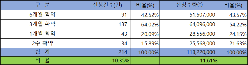 의무 보유 확약 건수는 214 건에 118,220,000주로 전체 신청 물량 대비 건수로는 10.35%, 수량으로는 11.61%였으며, 3개월 확약 비중이 제이 ㄹ높았고, 그 뒤를 6개월 확약이 이었습니다.