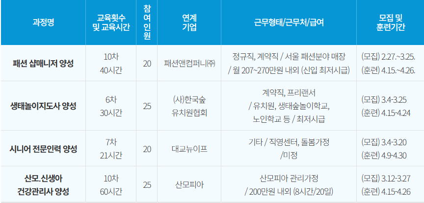 또 중장년 채용 수요가 확정된 기업·기관 등과 협력해 맞춤형 직무 교육을 제공하는 ‘4050 직무훈련’도 △패션샵매니저 △생태놀이지도사 △산모·신생아 건강관리사 △시니어 전문인력 등 4개 분야에서 참여자를 순차적으로 모집합니다.