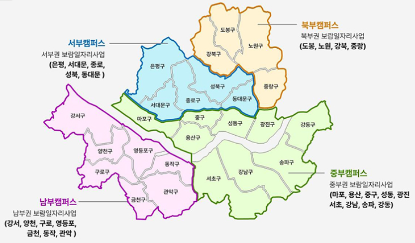 서부·중부·남부·북부권에서 참여자를 통합해 총 1,093명을 모집하는데, 각 권역별 ▴어르신 급식 등 '복지분야' ▴디지털 취약계층을 지원하는 '교육분야' ▴문화시설 공간과 프로그램을 관리하는 '문화분야'를 선택할 수 있으며, 거주지 상관없이 희망하는 활동처로 신청이 가능합니다.