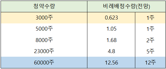 비례배정의 경우 1주 배정을 위한 커트라인은 3,000주로 전망되고 있습니다.