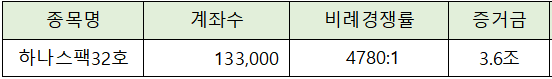 하나 스팩 32호의 청약에는 3.6조원의 증거금이 모이면서 비례경쟁률 4,780 : 1을 나타냈습니다.
