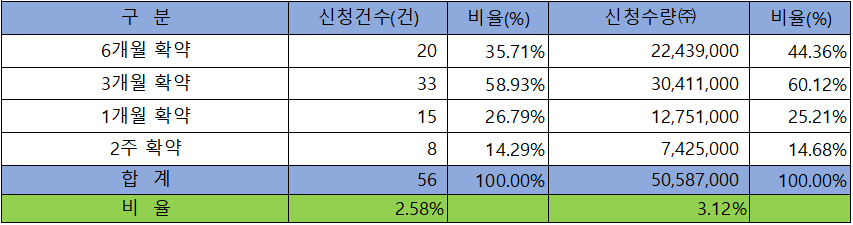 의무 보유 확약 건수는 56건에 50,587,000주로 전체 신청 물량 대비 건수로는 2.58%, 수량으로는 3.12%였으며, 3개월 확약 비중이 제일 높았고, 6개월 확약 비중이 그 뒤를 이었습니다.