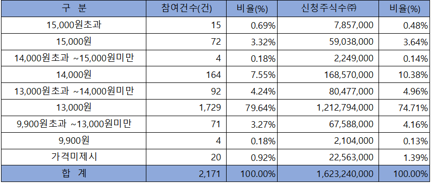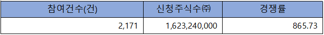 수요예측 참여 건수는 총 2,171건에 신청 주식수 1,623,240,000주로, 참여 경쟁률 865.73 : 1의 실적을 기록했습니다.