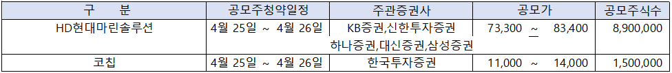 실제, 2024년 4월 공모주중에서 "민테크', "코칩", "이노그리드" "디앤디파마텍"등 4 종목이 당초 청약 일정이 3월 중으로 잡혀있었으나, 4월로 연기되어 4월에 새로 청약 일정이 진행되는 종목은 "제일엠엔에스"와 "HD현대마린솔루션" 2 종목인데, 대형 공모주인 "HD현대마린솔루션"에 관심이 집중될 것으로 보입니다.