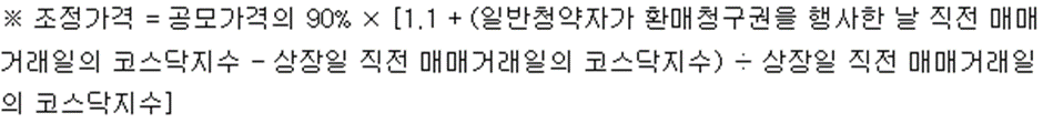 다만, 환매 청구권 행사일 직전 거래일의 코스닥 지수가 상장일 직전 거래일의 10% 이상 하락한 경우 조정가격을 적용합니다.