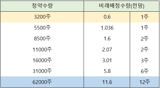 비례배정의 경우 1주 배정을 위한 커트라인은 3,200주로 전망되고 있습니다.