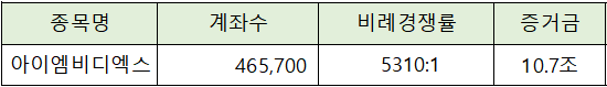 아이엠비디엑스의 청약에는 10.7조원의 증거금이 모이면서 비례경쟁률 5,310 : 1의 높은 경쟁률을 나타냈습니다.