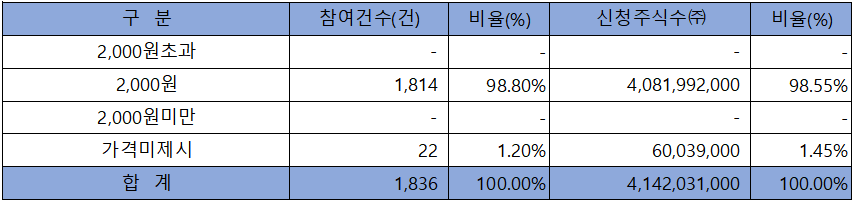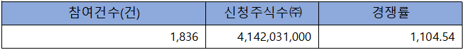 수요예측 참여 건수는 총 1,836건에 신청 주식수 4,142,031,000주로, 참여 경쟁률 1,104.54 : 1의 실적을 기록했습니다.