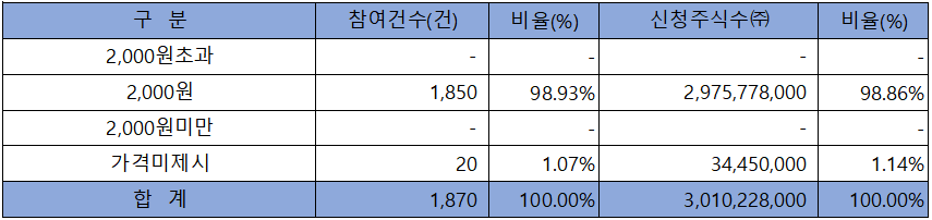 수요예측 참여 건수는 총 1,870건에 신청 주식수 3,010,228,000주로, 참여 경쟁률 1,337.88 : 1의 실적을 기록했습니다.