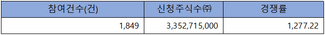 수요예측 참여 건수는 총 1,849건에 신청 주식수 3,352,715,000주로, 참여 경쟁률 1,277.22 : 1의 실적을 기록했습니다.