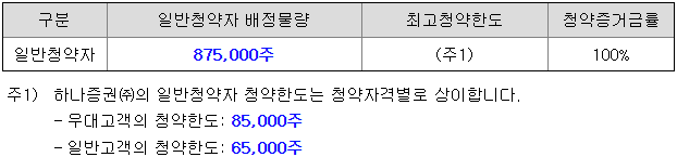 하나증권의 일반 청약자 배정 물량은 875,000주이고, 일반 청약자의 최고 청약 한도는 일반 고객 기준 65,000주입니다.