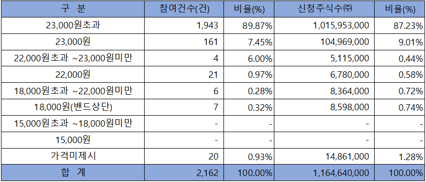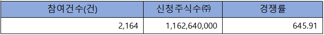 수요예측 참여 건수는 총 2,164건에 신청 주식수 1,162,640,000주로, 참여 경쟁률 645.91 : 1의 실적을 기록했습니다.