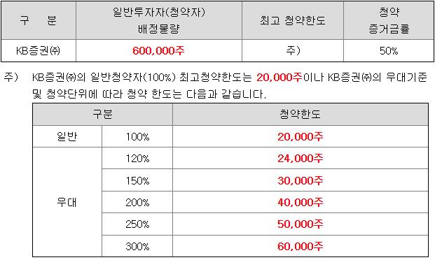 KB증권의 일반 청약자 배정 물량은 600,000주이고, 일반 청약자의 최고 청약 한도는 일반 고객 기준 20,000주입니다.