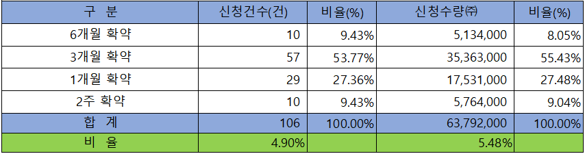 의무 보유 확약 건수는 106건에 63,792,000주로 전체 신청 물량 대비 건수로는 4.90%, 수량으로는 5.48%였으며 3개월 확약 비중이 제일 높았습니다.