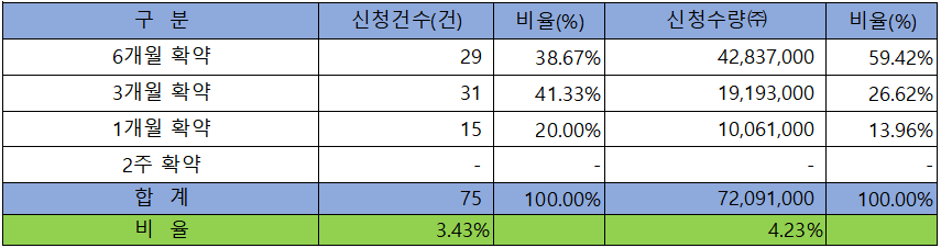 의무 보유 확약 건수는 75건에 72,091,000주로 전체 신청 물량 대비 건수로는 3.43%, 수량으로는 4.23%였으며, 수량 기준으로 6개월 확약 비중이 제일 높았습니다.