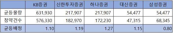증권사별 균등 배정은 증권사별로 차이가 있지만 삼성증권의 0.8주를 제외하고는 1.10주 ~ 1.27주로 대부분의 청약자가 균등으로 1주를 배정받을 수 있을 것으로 전망되고 있습니다.