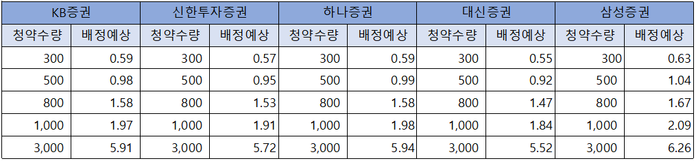 이 역시 증권사별로 차이가 있지만 300주 청약 시 0.55주에서 0.63주 배정이 예상되어 2명 중 1명은 1주 배정이 가능한 것으로 예상되고 있으며, 500주 신청한 경우 거의 모든 분들이 1주 배정을 기대해 보아도 좋을 것 같습니다.(물론 500주 신청해도 1주 배정이 안 되는 경우도 있을 수 있습니다)