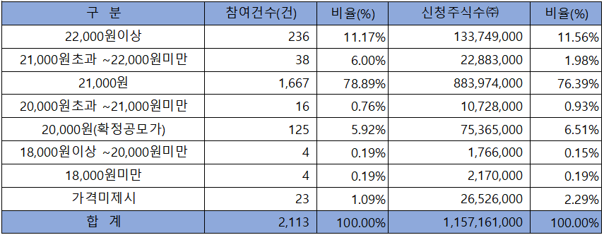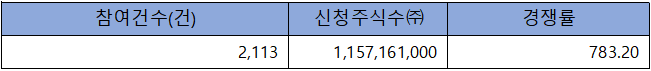 수요예측 참여 건수는 총 2,113건에 신청 주식수 1,157,161,000주로, 참여 경쟁률 783.20 : 1의 실적을 기록했습니다.