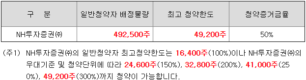 NH투자증권의 일반 청약자 배정 물량은 492,500주이고, 일반 청약자의 최고 청약 한도는 일반 고객 기준 16,400주입니다.