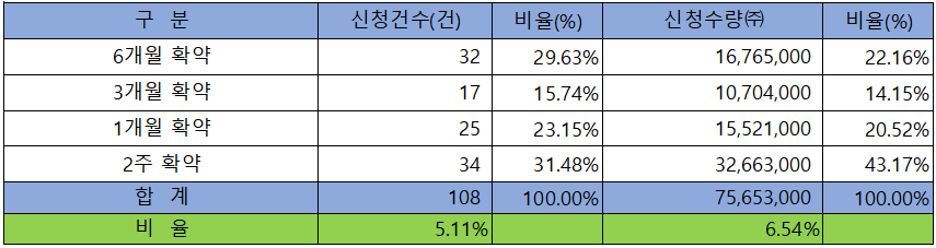 의무 보유 확약 건수는 108건에 75,653,000주로 전체 신청 물량 대비 건수로는 5.11%, 수량으로는 6.54%였으며, 2주 확약 비중이 제일 높았습니다.