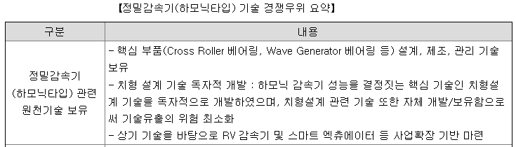 동사의 로보 드라이브(ROBO DRIVE)라는 정밀 감속기 제품은 하모닉 타입 감속기로 산업용 로봇의 핵심 부품인데, 높은 기술 진입 장벽으로 인해 일본 HDS(Harmonic Drive Systems)社가 사실상 독점하고 있었으나, 일본과의 무역 마찰과 공급 부족으로 인해 국산화 요구가 높아짐에 따라 동사의 자체 기술력을 통해 국내 최초 정밀 감속기 개발 및 제품화에 성공하였습니다.