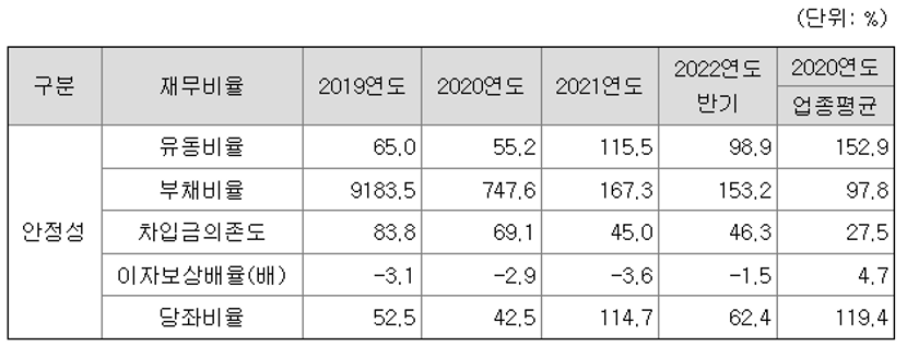 이자보상배율 또한 음의 실적을 나타내고 있는데 향후 흑자 실현이 성공하면 개선될 전망입니다.