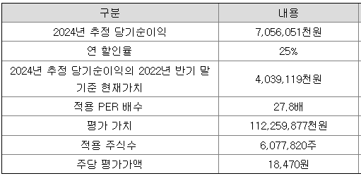 회사의 주당 평가가액은 2024년 추정 순이익을 2022년 반기말 현가로 할인 환산하여 주당 순이익을 구한 다음 유사 회사의 평균 PER를 적용하여 산출한 것입니다.